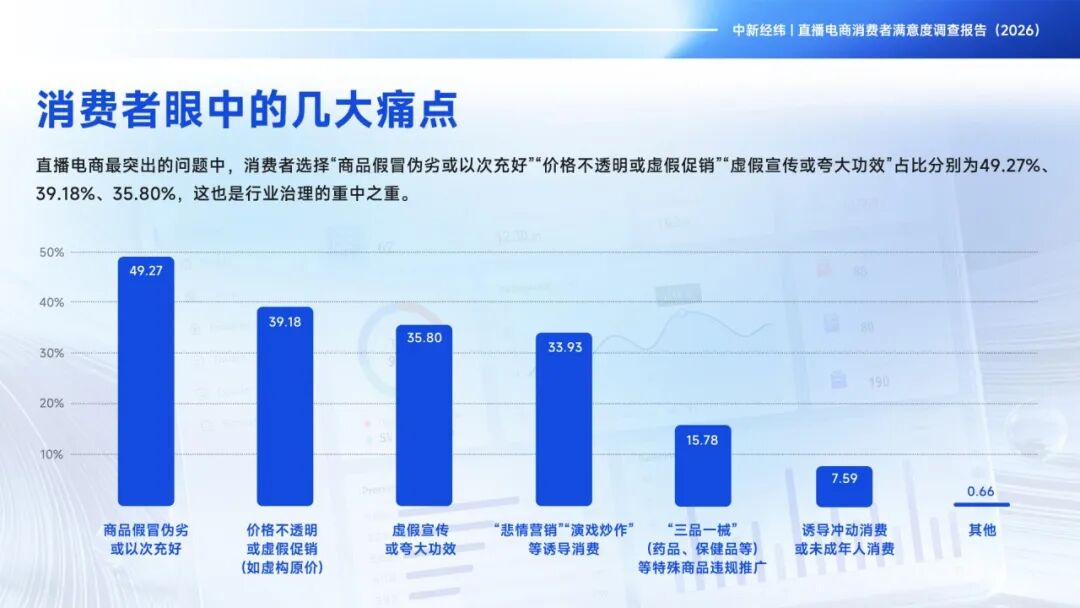 Der Bericht zeigt, dass Live - E - Commerce zu einem Hauptverbrauchskanal geworden ist. In Bezug auf die Verbrauchsgüterkategorien belegen Kosmetika, Lebensmittel und Haushaltswaren die ersten drei Plätze. Bei den prominentesten Problemen im Live - E - Commerce haben die Verbraucher die Optionen „Fälschung und Schlechtigkeit von Waren oder die Abgabe von minderwertigen Waren als hochwertige“ (mit einem Anteil von 49,27 %), „Preisuntransparenz oder falsche Preisaktionen“ (39,18 %) und „Falsche Werbung oder Übertreibung der Wirkungen“ (35,80 %) gewählt.