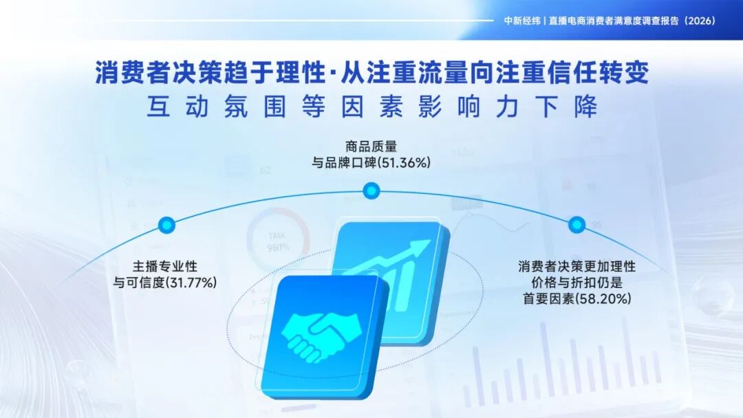 Betrachtet man die Veränderungen im Kaufverhalten, so tendieren die Verbraucher zu rationaleren Entscheidungen und wandeln sich von einer Fokussierung auf Traffic hin zu einer Fokussierung auf Vertrauen. Preis und Rabatt sind immer noch die wichtigsten Faktoren bei den Kaufentscheidungen der Verbraucher, mit einem Anteil von 58,2 %. Danach folgen die Qualität der Waren und das Markenimage, mit 51,36 %. Die Professionalität und Zuverlässigkeit der Moderatoren haben einen Anteil von 31,77 %. Gleichzeitig ist der Kundenservice und die Produktdarstellung im Live - E - Commerce deutlich verbessert. Die Gesamtzufriedenheitsrate (sehr zufrieden + eher zufrieden) liegt bei 83,69 %.