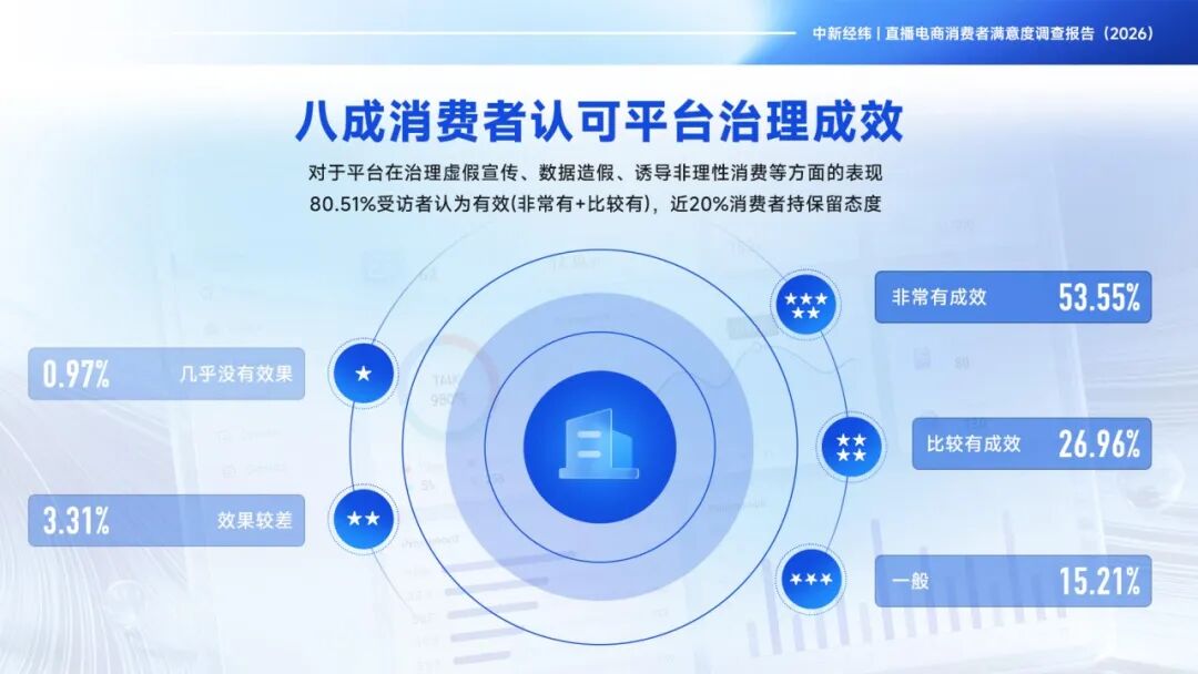 Nach dem Bericht halten 80,51 % der Befragten die Maßnahmen der Plattformen bei der Bekämpfung von falscher Werbung, Datenmanipulation und der Induzierung von irrationalem Konsum für effektiv (sehr effektiv + eher effektiv), und fast 20 % der Verbraucher halten sich zurück.