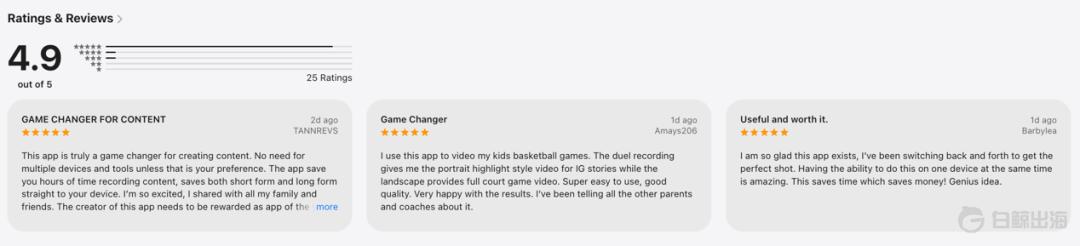 In den 25 Bewertungen, die derzeit im App Store angezeigt werden, hat „DualShot Recorder“ eine hohe Note von 4,9 Punkten erhalten.