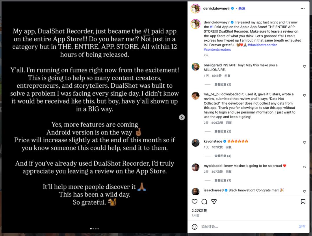 Derrick Downey Jr. nahm geschickt einen Ständer mit zwei Handys, einem horizontal und einem vertikal montiert, und zeigte die übliche Vorgehensweise von Inhaltserstellern, um Videos für TikTok und YouTube zu produzieren. Dann öffnete er „DualShot Recorder“. Die App nutzt die beiden hinteren Kameras des iPhones und liefert direkt zwei perfekt synchronisierte, aber unterschiedlich komprimierte Dateien. Während des gesamten Vorgangs konnte Derrick Downey Jr. seine Begeisterung nicht verbergen und nannte die App „Game Changer“. Über seine Erwartungen hinaus erreichte „DualShot Recorder“ in weniger als 12 Stunden nach der Veröffentlichung die Spitze der US-amerikanischen iOS-Preisecharts.