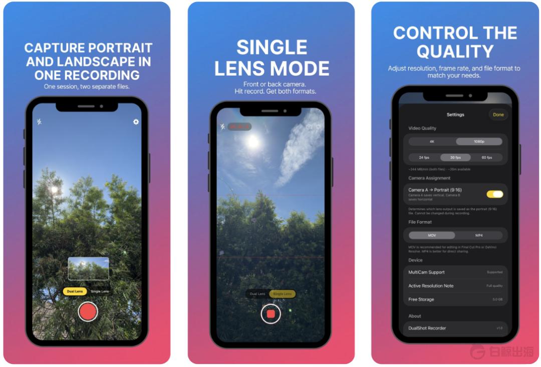 Im Doppellinsenmodus verwendet die App die beiden Kameras des iPhones (üblicherweise Weitwinkel- und Superweitwinkelobjektiv) zum gleichzeitigen Filmen. Während der Aufnahme werden die beiden Komprimierungen in einem Bild-in-Bild-Format angezeigt, und am Ende erhält man zwei native Videos. Im Einzellinsenmodus hilft eine Hilfslinie dem Benutzer bei der Komprimierung während der Aufnahme. In der Regel werden zwei Dateien durch Zuschneiden erstellt, was besonders für Aufnahmen mit der Frontkamera geeignet ist.