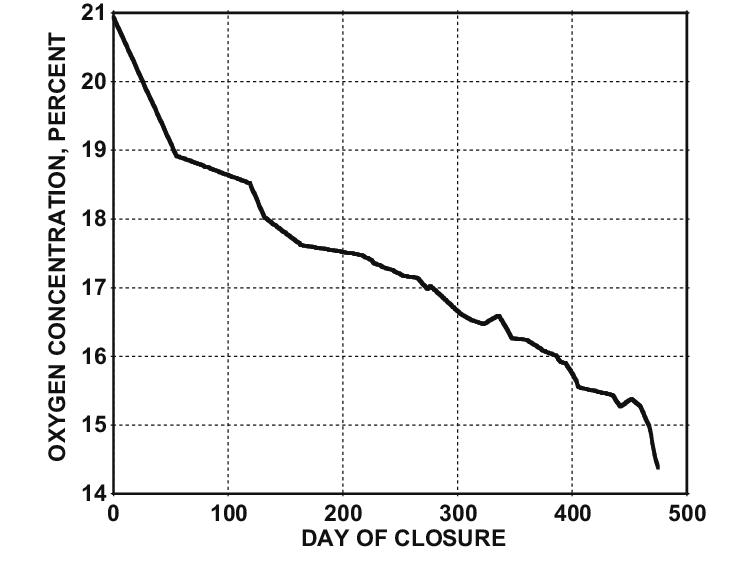 The curve of the decreasing oxygen concentration in "Biosphere 2". (Image source: William Dempster)