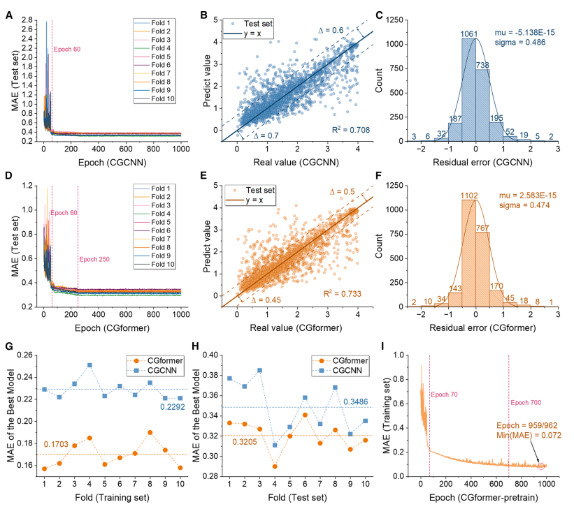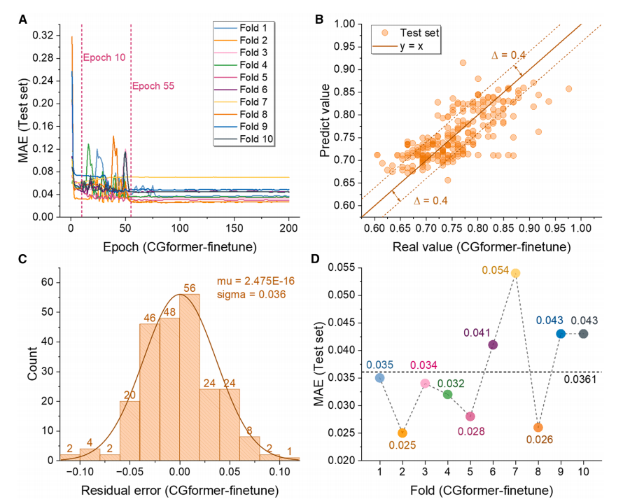 In the fine - tuning stage (as shown in the figure below), after 200 rounds of fine - tuning of the pre - trained CGformer, the MAE significantly decreased after about 10 rounds. The average MAE of the final 10 - fold cross - validation was only 0.0361. After fine - tuning, the deviation between the predicted values and the real values was further reduced. The residuals were mainly concentrated in the range of - 0.05 to 0.05 and showed a good normal distribution, proving that its prediction of Eb in high - entropy systems had extremely high accuracy, reflecting its application potential in scenarios with data scarcity.