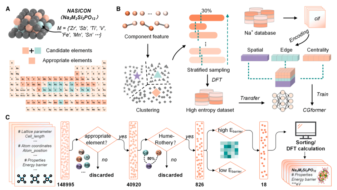 Computational dataset of HE - NSEs: Based on Na₃Zr₂Si₂PO₁₂ (as shown in the figure above), 45 potential high - entropy doping elements were considered at the Zr site, initially forming an initial chemical space containing 148,995 possible high - entropy structures. After multiple rounds of screening, including excluding unsuitable elements (radioactive, highly toxic, and expensive elements), constraining the atomic radius difference and charge balance, etc., the chemical space was further reduced to 826 relatively stable structures. Then, through unsupervised hierarchical clustering, they were divided into 20 groups. 30% of the structures were sampled from each group (a total of 238 structures), and their Eb values were obtained through density functional theory (DFT) calculations. Finally, a dedicated dataset for fine - tuning CGformer was formed, so that the model could be specifically adapted to the prediction task of sodium - ion Eb in high - entropy NASICON structures and improve the model's accuracy in the target scenario.