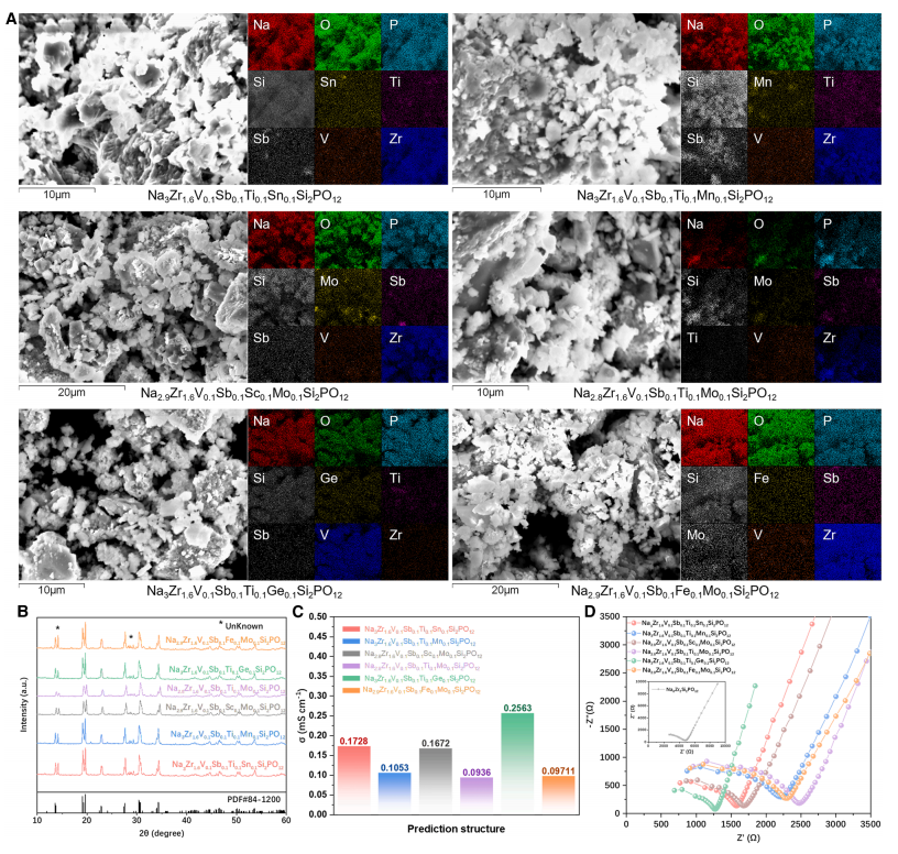 Finally, the researchers experimentally synthesized and electrochemically characterized the 6 optimal HE - NSEs screened by CGformer to verify their structures and performances. The results showed that these materials all exhibited excellent room - temperature ionic conductivity. At a room temperature of 25°C, the sodium - ion conductivity was between 0.093 and 0.256 mS/cm, significantly higher than that of undoped Na₃Zr₂Si₂PO₁₂.