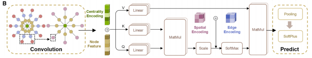 It is worth mentioning that the multi - head attention module enables each node to "pay attention" to all other nodes in the crystal graph, rather than just adjacent nodes, achieving the capture of long - range atomic interactions. Meanwhile, the addition of central encoding and spatial encoding also enables the model to not only recognize the chemical properties of atoms but also perceive their "positional importance" and "spatial relationship" in the structure, improving the model's characterization accuracy of complex crystals.
