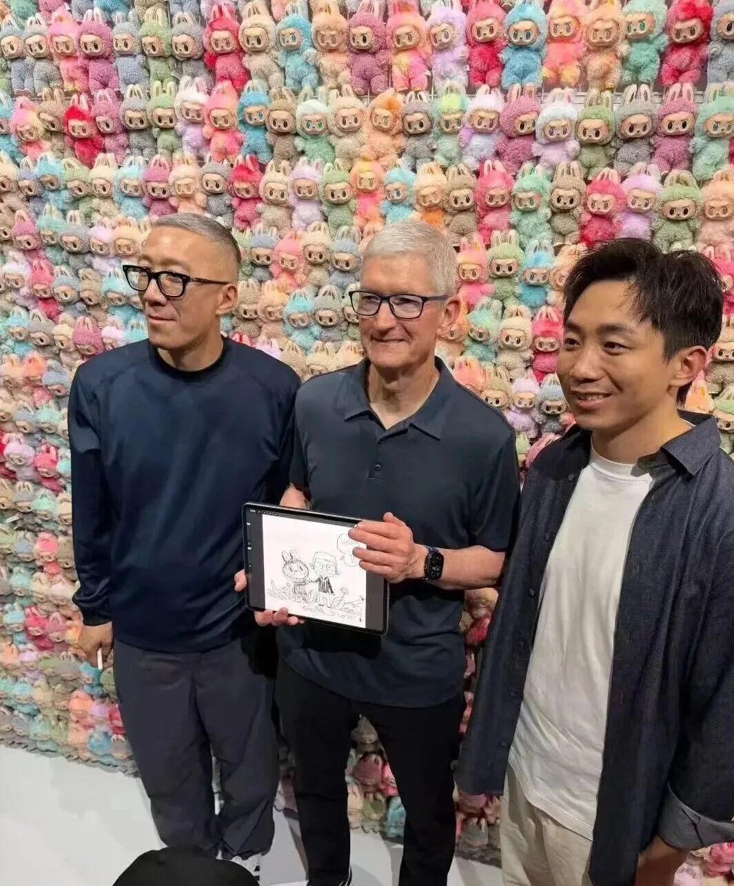 Technology blogger Eva reported that during the exhibition, Long Jiasheng showed Cook his creative inspiration and different artworks and introduced the creative background of the Labubu family. Interestingly, in front of the wall full of Labubu, artist Long Jiasheng demonstrated how to create paintings with an iPad Pro.