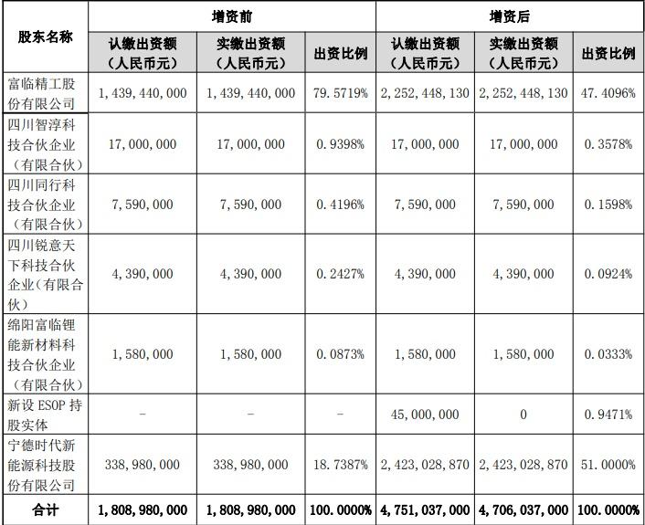 In March this year, Fuling Precision Industry released an announcement stating that Jiangxi Shenghua planned to introduce strategic investor CATL through capital increase and share expansion. The latter planned to subscribe for RMB 339 million of Jiangxi Shenghua's newly - increased registered capital with RMB 400 million and obtain 18.7387% of the equity on a fully - diluted basis after the completion of this transaction.