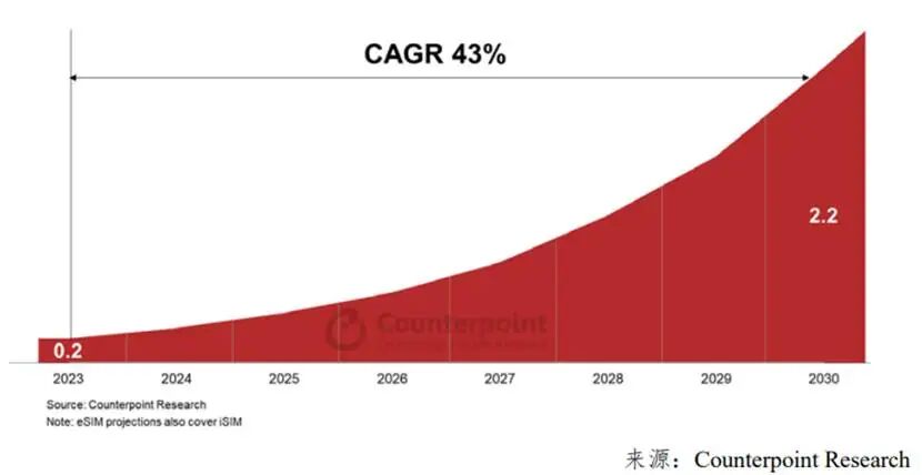 Looking at the past development process, the commercialization of IoT eSIM has been relatively smoother than that of mobile phone eSIM. According to data from Counterpoint, by the end of 2023, the number of eSIM connections in the IoT field was close to 200 million. It is estimated that by the end of 2030, the number of eSIM connections in the IoT field will reach 2.2 billion, with a compound annual growth rate of 43%.