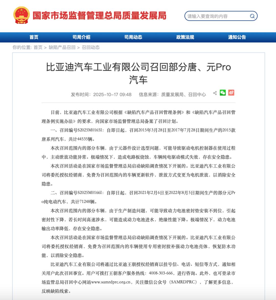 On October 17th, the official website of the State Administration for Market Regulation released a recall notice. According to relevant regulations, BYD Auto Industry Co., Ltd. initiated a recall plan for a total of 115,783 vehicles.