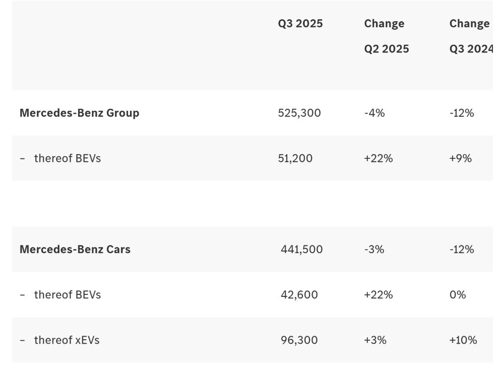 In terms of sales, Mercedes has announced its sales in the third quarter of this year. Data shows that Mercedes' passenger car sales in the third quarter of 2025 were 441,500 units, a year-on-year decrease of 12%.