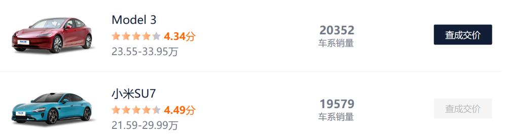 The sales of the Xiaomi SU7 and Tesla Model 3 in September (third-party data)