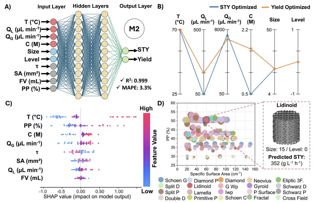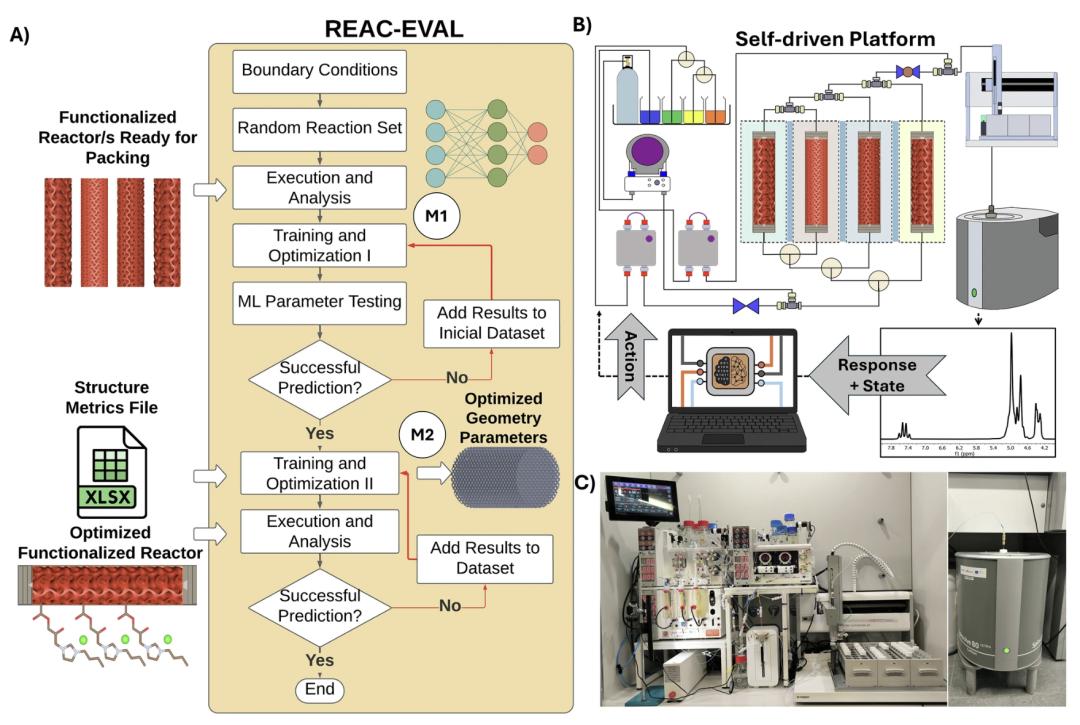 * Reac-Eval: Utilizes machine learning and real-time nuclear magnetic resonance (NMR) monitoring data analysis, and uses an artificial neural network (ANN) to simultaneously optimize the process and geometry; the experimental results are then fed back to the core machine learning model to promote the self-learning and self-iteration cycle of the reactor improvement.