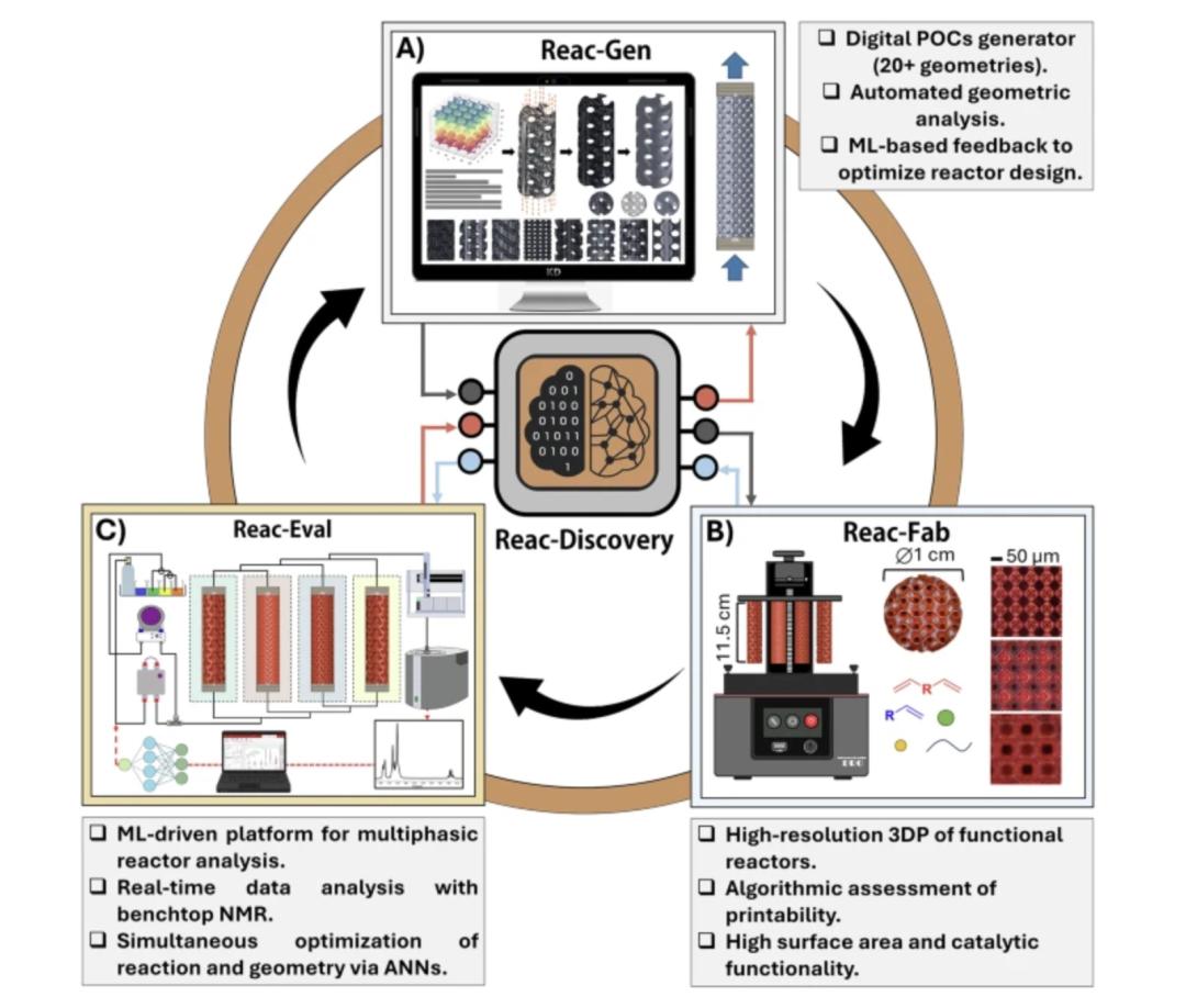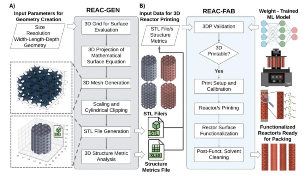 * Reac-Fab: Verifies the printability of the reactor through a high-resolution 3D printing algorithm, manufactures it, and then performs catalytic functionalization;