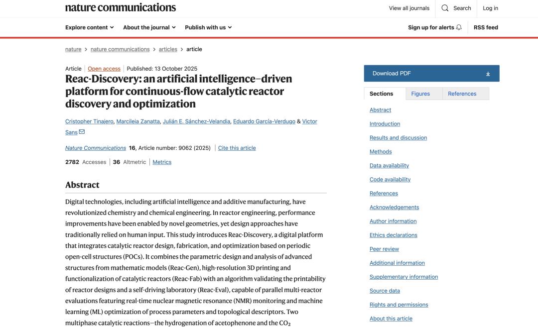 The relevant research results were published in Nature Communications under the title "Reac-Discovery: an artificial intelligence–driven platform for continuous-flow catalytic reactor discovery and optimization".