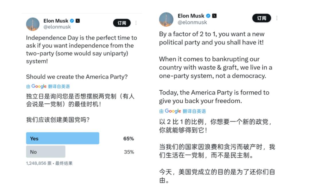 After the act was passed, Musk immediately launched a poll on social media, asking whether a "United States Party" should be established to "liberate" the American people from the two - party system where the Democratic Party and the Republican Party take turns in power. The next day, 65% of the voters agreed, and Musk then announced the establishment of the "United States Party".