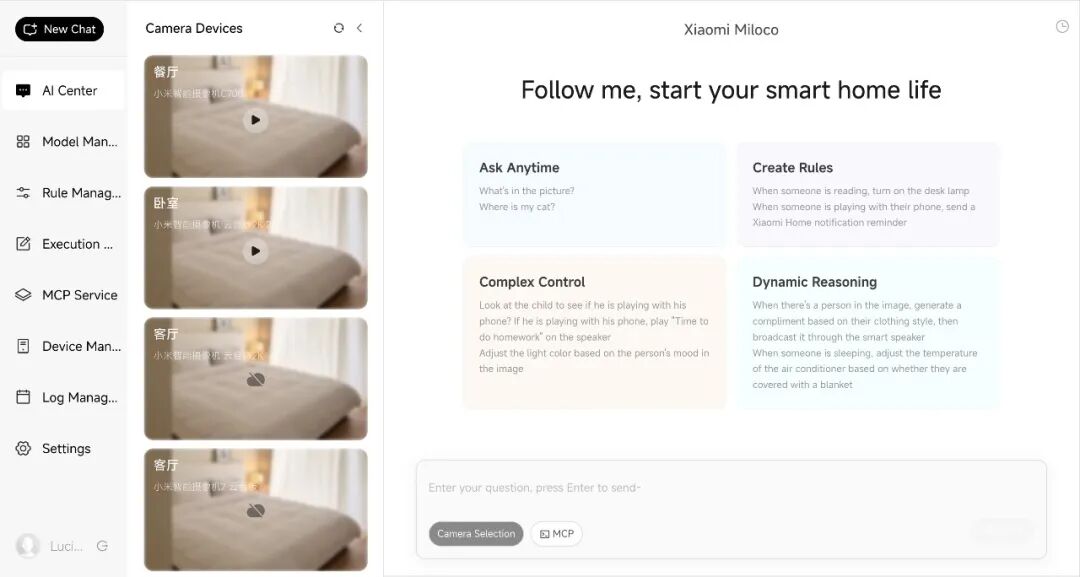 Miloco deploys its self - developed large model capabilities to edge devices in the home and provides an "AI brain" combined with the real - time visual information from Mi Home cameras. Specifically, Miloco has the following four major features: