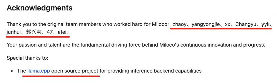 This time, in the acknowledgments of the Miloco project, nine original members of the Miloco team such as zhaoy and yangyongjie are mentioned, and thanks are given to the llama.cpp open - source project that provides the inference backend function.