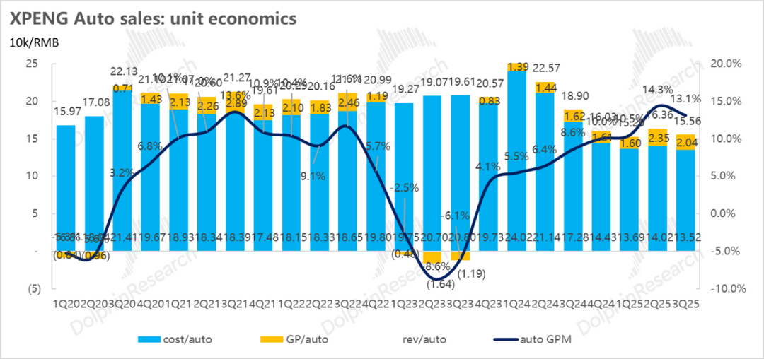 In the third quarter, XPeng's gross profit per vehicle declined by 3,000 yuan quarter - on - quarter to 20,000 yuan. Although the car - selling cost declined due to the release of economies of scale this quarter, the decline in the average selling price of cars was greater. Finally, the actual car - selling gross profit margin this quarter declined by 1.2 percentage points quarter - on - quarter to 13.1%.