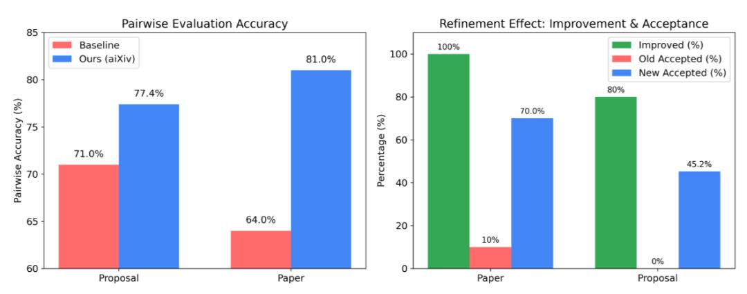 配对准确率与评审改进效果的评估。改进评审流程带来了显著提升:所有论文(100%)和大部分提案(80%)在返修后质量得到改进。平均接收率大幅上升,提案从 0% 提高至 45.2%,论文从 10% 提高至 70%。