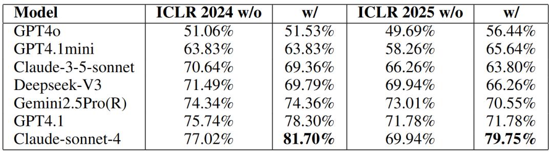 不同模型在ICLR 2024与ICLR 2025测试数据集上的论文Pairwise准确率对比。w/o:不使用 RAG;w/:使用 RAG