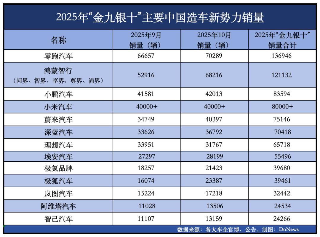 DoNews once counted the sales performance of 13 major domestic new car - making forces during the peak car - selling seasons of "Golden September and Silver October" (September and October). The top 5 new car - making force companies in cumulative sales were Leapmotor with 136,900 vehicles, Hongmeng Zhixing with 121,100 vehicles (including AITO, ZEEKR, and other brands), XPeng Motors with 83,600 vehicles, Xiaomi Auto with over 80,000 vehicles, and NIO with 75,100 vehicles (including NIO, LeDao, and Firefly). Li Auto's cumulative sales were 65,700 vehicles, a nearly 40% decrease compared to the same period last year, ranking 7th.