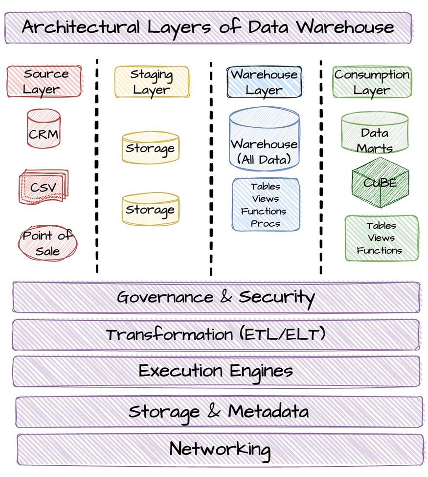 The canonical architecture emerged: Extract, Transform, Load (ETL) pipelines extract data from multiple source systems (CRM, ERP, transactional databases), clean and transform it according to business rules, and load it into the data warehouse according to a carefully designed schema.