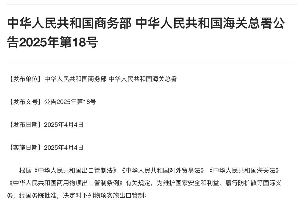 In response to the "tariff stick" waved by the United States, on April 4, 2025, China's Ministry of Commerce and General Administration of Customs announced export controls on seven categories of medium - heavy rare - earth related items, including samarium, gadolinium, terbium, dysprosium, lutetium, scandium, and yttrium.