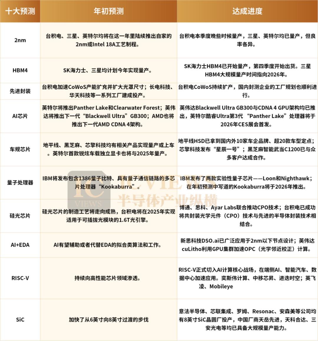 As 2025 draws to a close, it's time to assess the "Top Ten Semiconductor Technology Trend Predictions" that dominated headlines at the beginning of the year. Core areas such as 2nm, HBM4, advanced packaging, AI processors, intelligent driving chips, and quantum processors have remained the focus of the industry. So, how much progress has been made on these predictions over the past year? Today, let's follow the timeline to dissect the real advancements in these ten key directions.