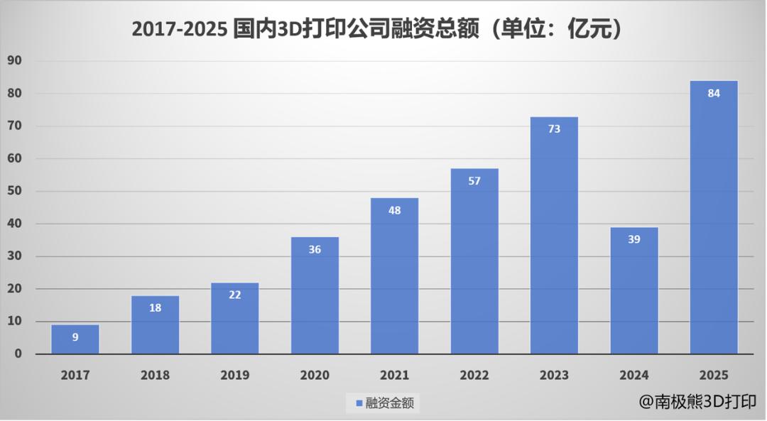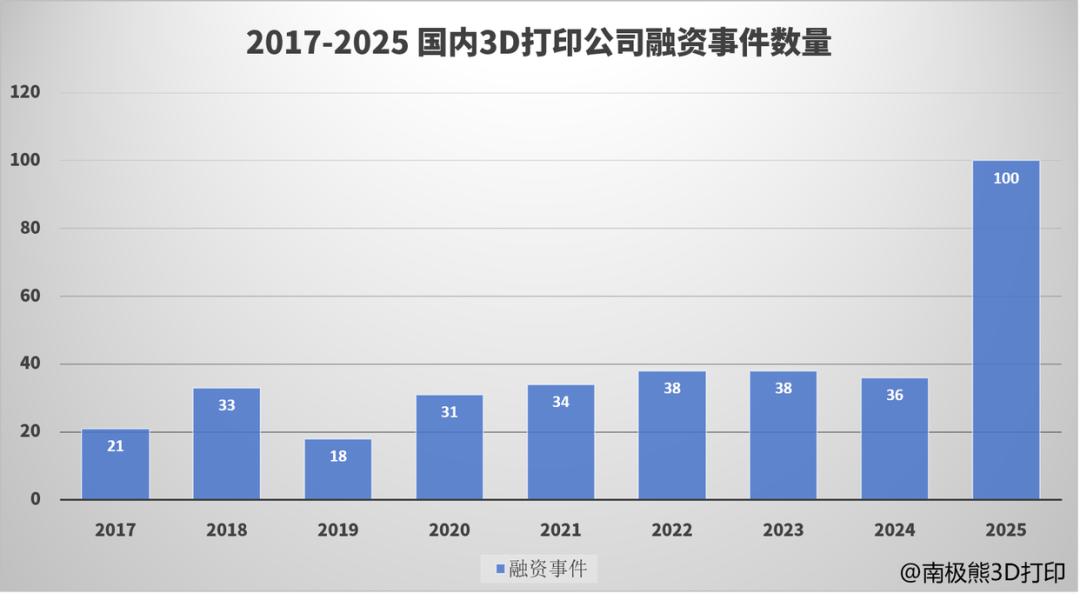 Beyond these scattered financing cases, a set of core data further confirms the soaring popularity of the sector. According to data from Nanji Xiong 3D Printing, in the past few years, the number of investment and financing events in the domestic 3D printing industry has basically remained between 30 and 40. In 2025, the number of financing events reached 100 (involving 81 companies, with some companies having 2 - 3 rounds of financing), almost tripling.