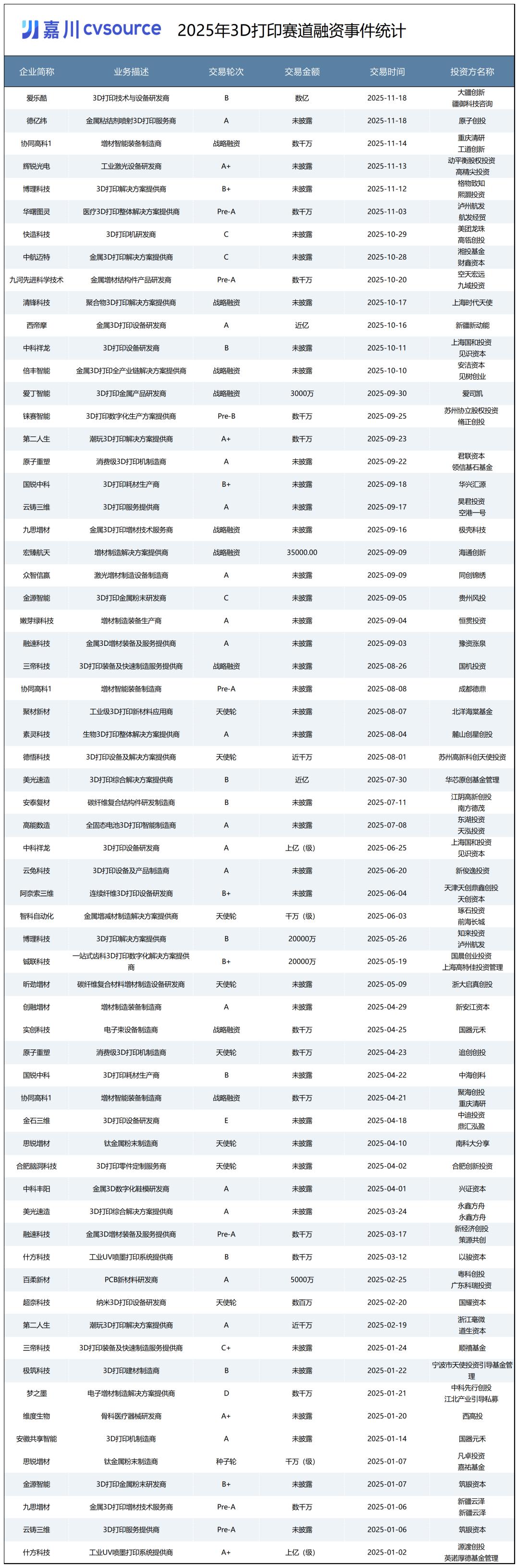 The trends in capital also reflect the popularity of the industry from the side. In just two months at the end of 2025, there were a series of major investment and financing news in the 3D printing sector: