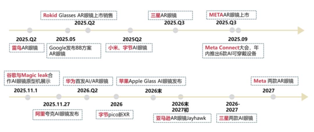 In February 2025, Meta's Ray-Ban smart glasses sold over 2 million pairs, and the annual shipment is expected to reach 4 - 5 million pairs. Overseas giants Google and Samsung restarted their AI glasses projects, and Apple finalized the release schedule for its AI glasses.