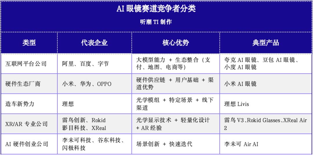 Currently, there are a wide variety of AI glasses on the market with a large price range from a few hundred yuan to several thousand yuan. The main reason is the different positioning of product forms. In this chaotic competition, not all players are on an equal footing. Currently, there are five main types of domestic competitors: