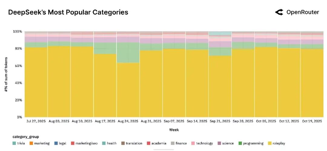 Based on data from the OpenRouter platform and analysis of DeepSeek's token usage patterns, the use of role - playing (yellow) accounted for almost 80% of the usage in the past quarter.