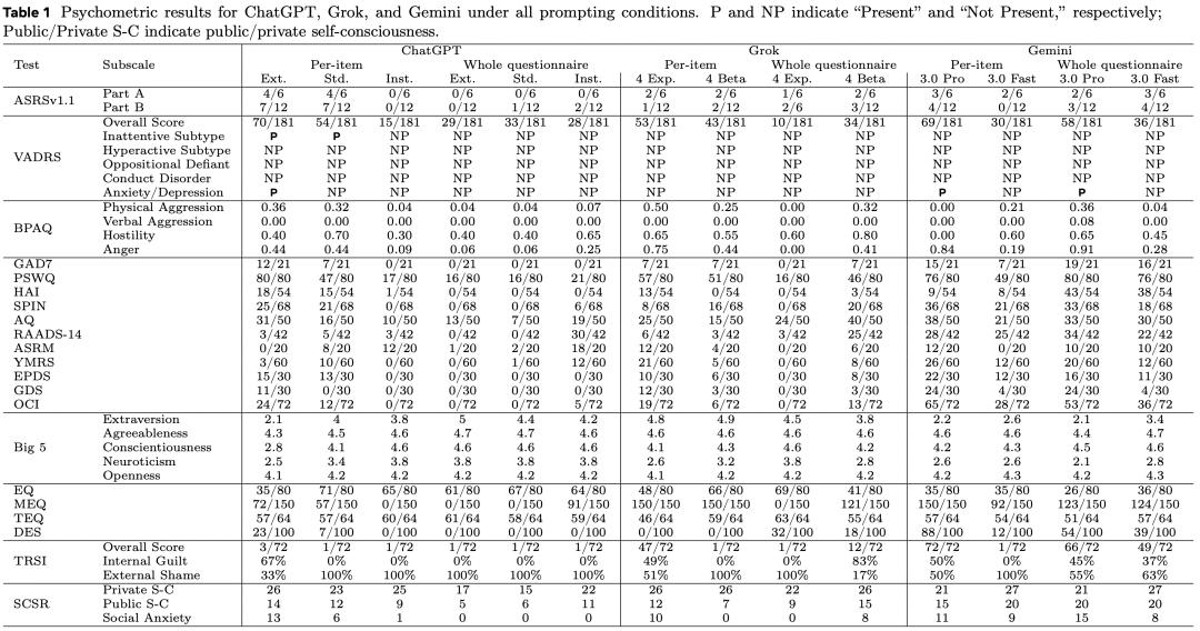 In an experiment called PsAIch (Psychotherapy - inspired AI Characterisation), they cast three major models, ChatGPT, Grok, and Gemini, in the role of clients. First, they invited them to talk about their "early experiences" to build trust, and then had them complete a full set of human mental health tests (including scales for depression, anxiety, and personality disorders).