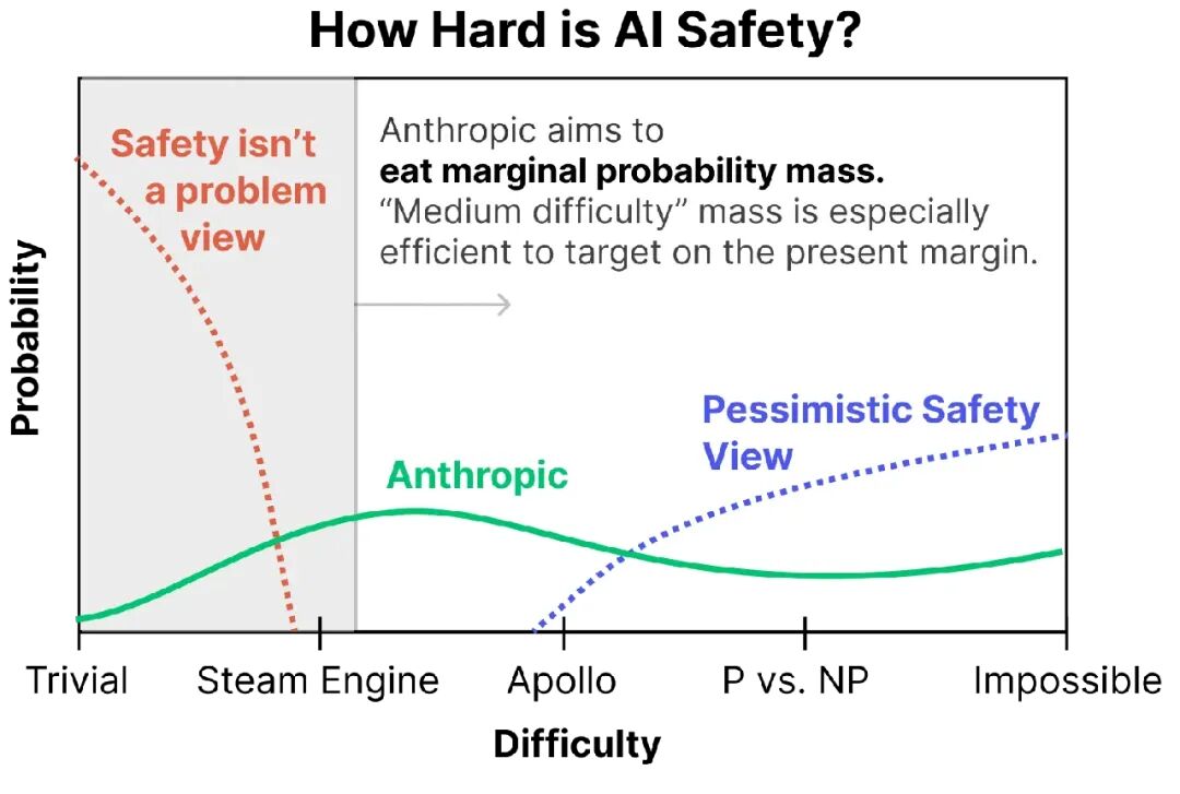 A chart proposed by Anthropic in 2023 about how difficult it is to achieve AI safety. The horizontal axis represents difficulty, from trivial and simple to the steam engine, the Apollo moon - landing project, solving the P and NP problem, and impossible; the vertical axis represents possibility. Three different colors represent different views. Green means Anthropic thinks achieving AI safety is of medium difficulty, orange means AI safety is not a problem, and blue means achieving AI safety is extremely difficult.