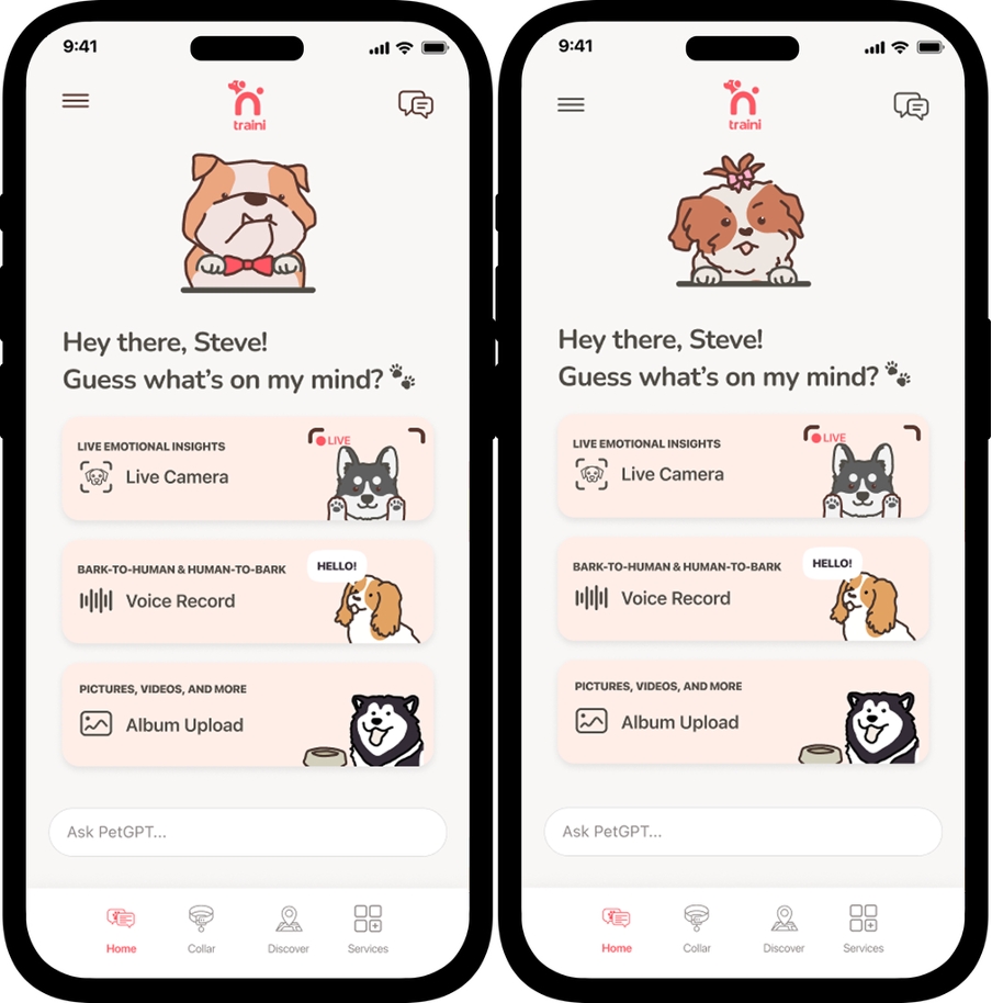 Currently, Traini's core software product is PEBI (Pet Empathic Behavior Interface). This system supports multimodal interactions across text, images, videos, and audio. By analyzing pets' barks, expressions, and behaviors, it estimates the psychological states of pets and outputs the results in a form similar to human conversations, enabling "conversations" between humans and pets.