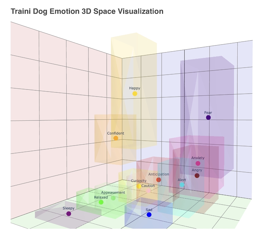 Traini's developed 3D pet emotion model uses a custom immediate emotion vector to model the "internal emotions" of pets and the "external time and location context" in a unified way. Image provided by the company.