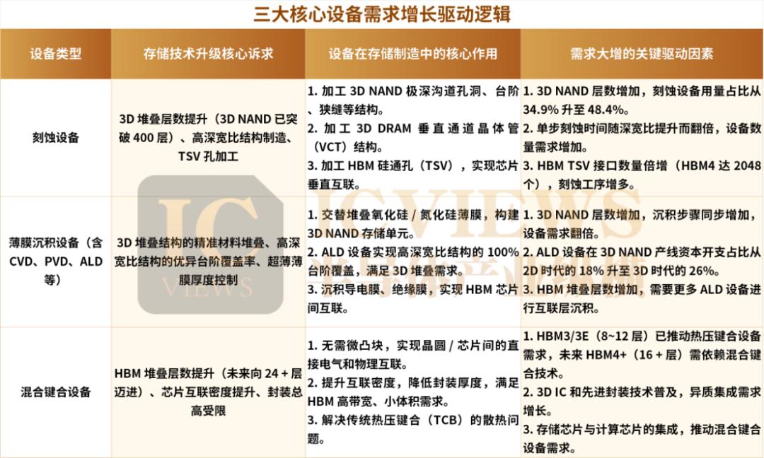 Among them, the expansion of 3D NAND production and the evolution of DRAM technology have the strongest driving effect on etching/deposition equipment, while the expansion of HBM production further boosts the demand for equipment such as lithography, ALD, and hybrid bonding.