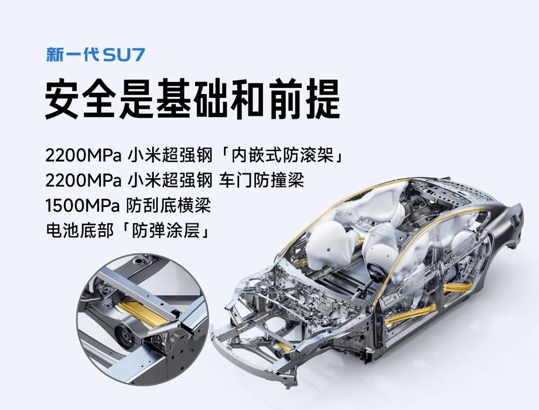 In addition, the upgrades to the safety configuration of the new - generation SU7 are particularly prominent. The new car is standard with a 2200MPa ultra - strong steel embedded roll - cage and a 2200MPa door anti - collision beam across all versions. The battery system is newly equipped with a 1500MPa anti - collision cross - beam and a bottom protective coating. The number of airbags has been increased from 7 to 9, and a mechanical redundant structure has also been added inside the door handles.