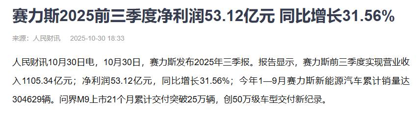 The success of SERES cannot be judged solely by the huge "tuition fee" it has paid. We also need to see what it has gained. In terms of profit, SERES is not at a loss. Although the procurement fees are indeed high, SERES' profits are also quite high. In 2024, SERES achieved a net profit of 5.946 billion yuan. In the first three quarters of 2025, SERES' net profit exceeded 5.3 billion yuan, and it is expected to earn 8.3 to 10 billion yuan for the whole year.