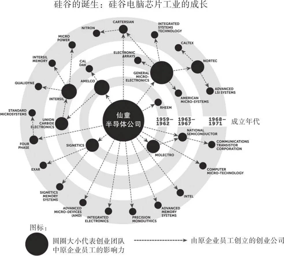 In the late 1960s, former employees of Fairchild Semiconductor founded 38 companies, and in the early 1970s, it reached 41. By 1984, there were more than 70 companies directly or indirectly spun off from Fairchild Semiconductor, including the well-known Intel, Molectro, AMD, etc.