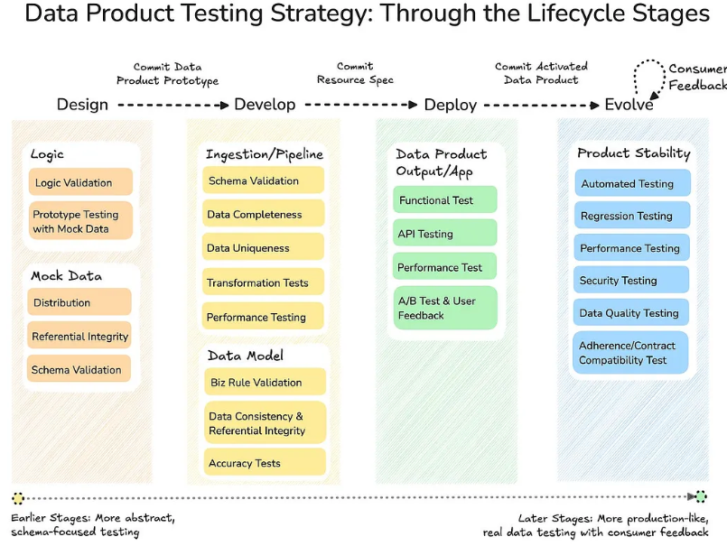 Let's see how the above components work at each stage of the data product lifecycle. What specific testing requirements apply and how to implement them.