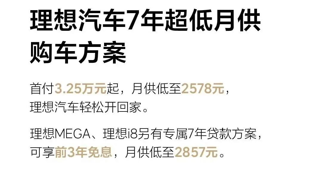 Before this, Li Auto also posted that from January 20, 2026, when purchasing a car, all models can enjoy a 7-year ultra-low monthly payment car purchase plan: the down payment starts from 32,500 yuan, and the monthly payment can be as low as 2,578 yuan. In addition, for the MEGA and i8 models, there is also an exclusive 7-year loan plan, with the possibility of interest-free in the first three years and a monthly payment as low as 2,857 yuan.