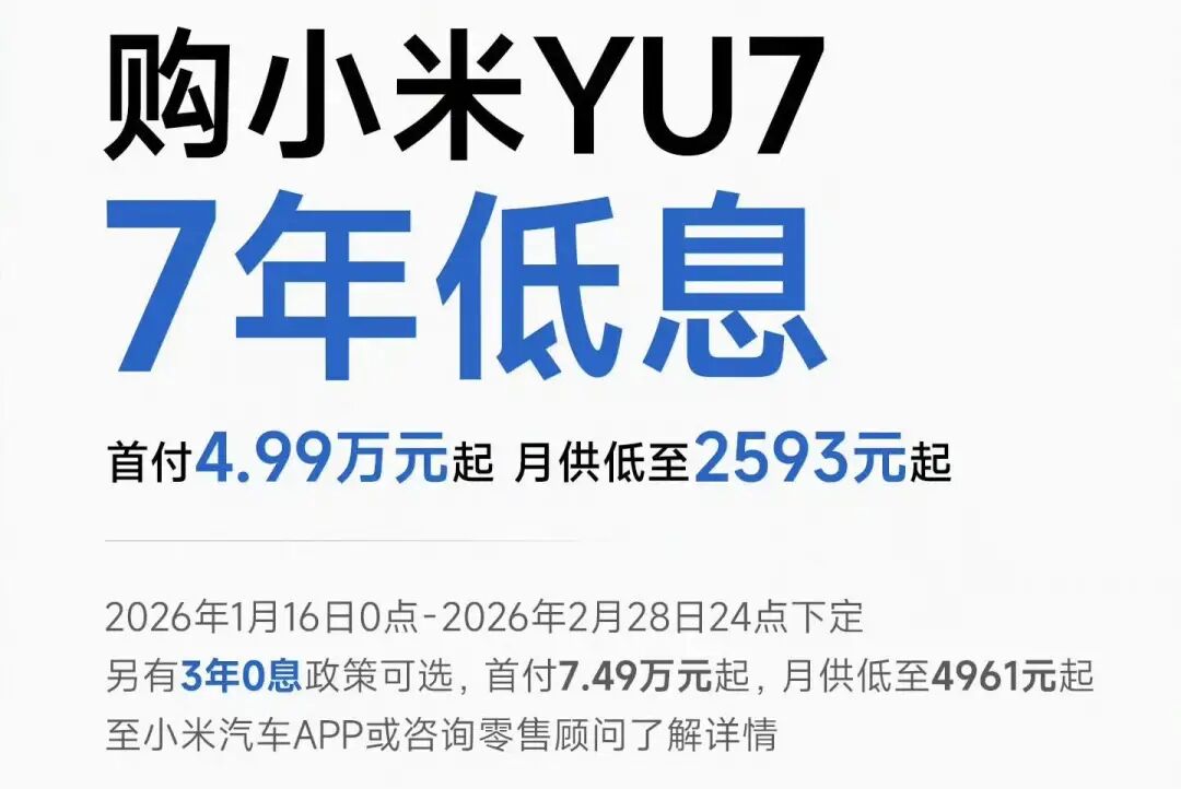 For the YU7 model, the down payment starts from 49,900 yuan, and the monthly payment can be as low as 2,593 yuan. The event starts at 0:00 on January 16 and ends at 24:00 on February 28. There is also a "3-year interest-free" policy available, with a down payment starting from 74,900 yuan and a monthly payment as low as 4,961 yuan.