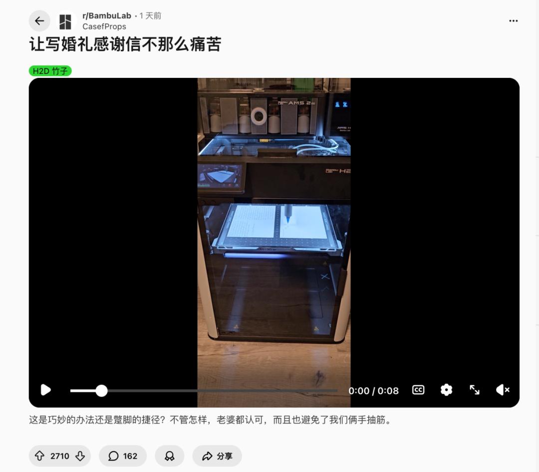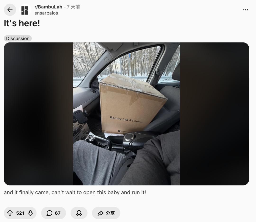 For example, in Bambu's Reddit community, when someone shares "Just got the machine and going home to unbox it", they'll receive a lot of likes and experience - sharing. Everyone can't wait to welcome a new member.
