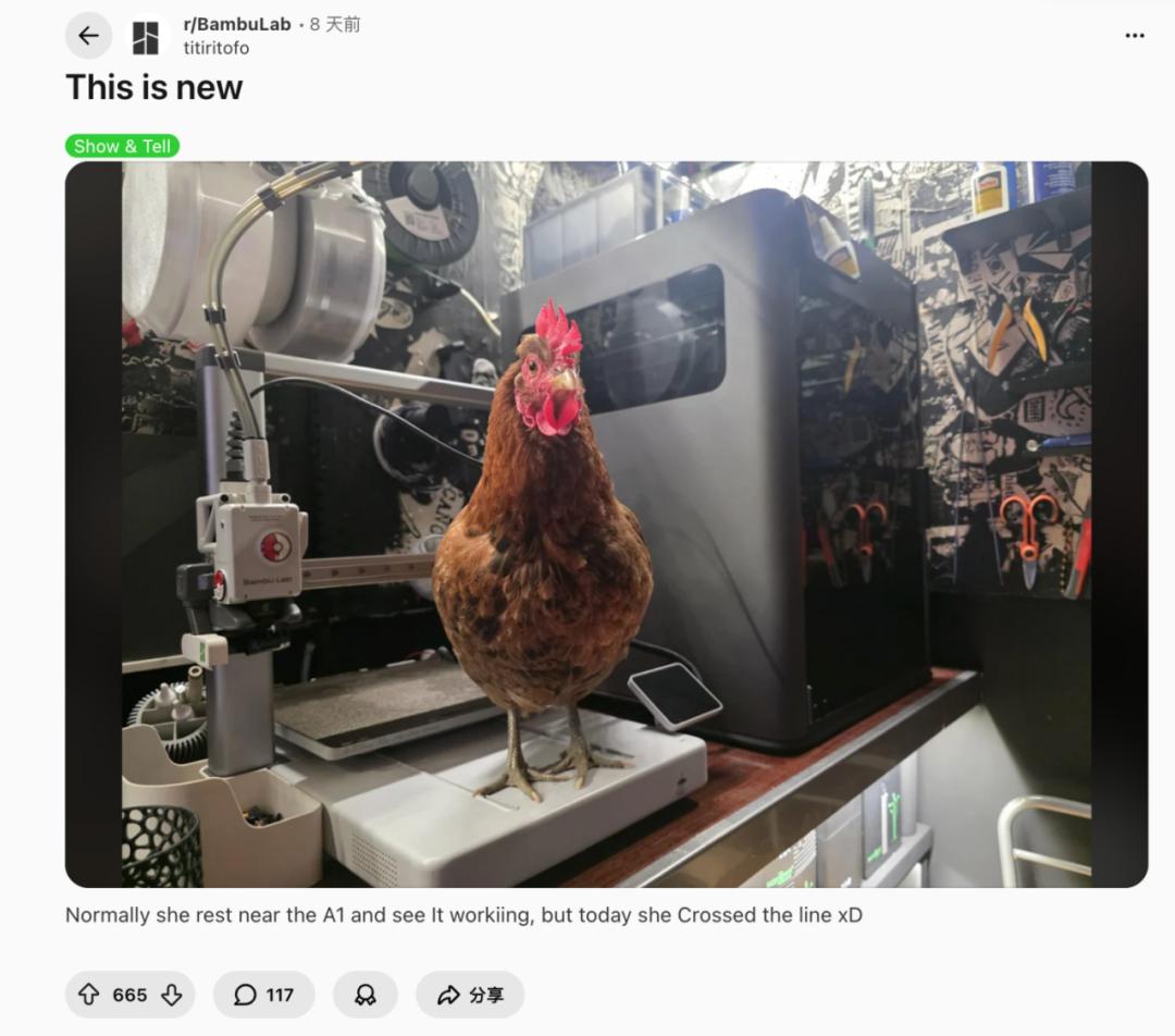 On the Bambu Lab community on Reddit, a netizen shared a photo of their chicken nonchalantly standing on the Bambu A1 machine and refusing to leave. The netizen complained, "Usually it just sits beside and watches, but today it crossed the line."