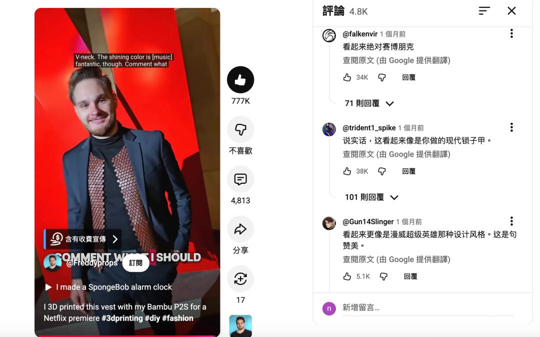 For example, Freddyprops, a YouTuber who is also an artist and a maker of film and special - effect props, 3D printed a chain mail using Bambu's machine and wore it to the premiere of the Netflix film "Jay Kelly", creating a cross - border effect.