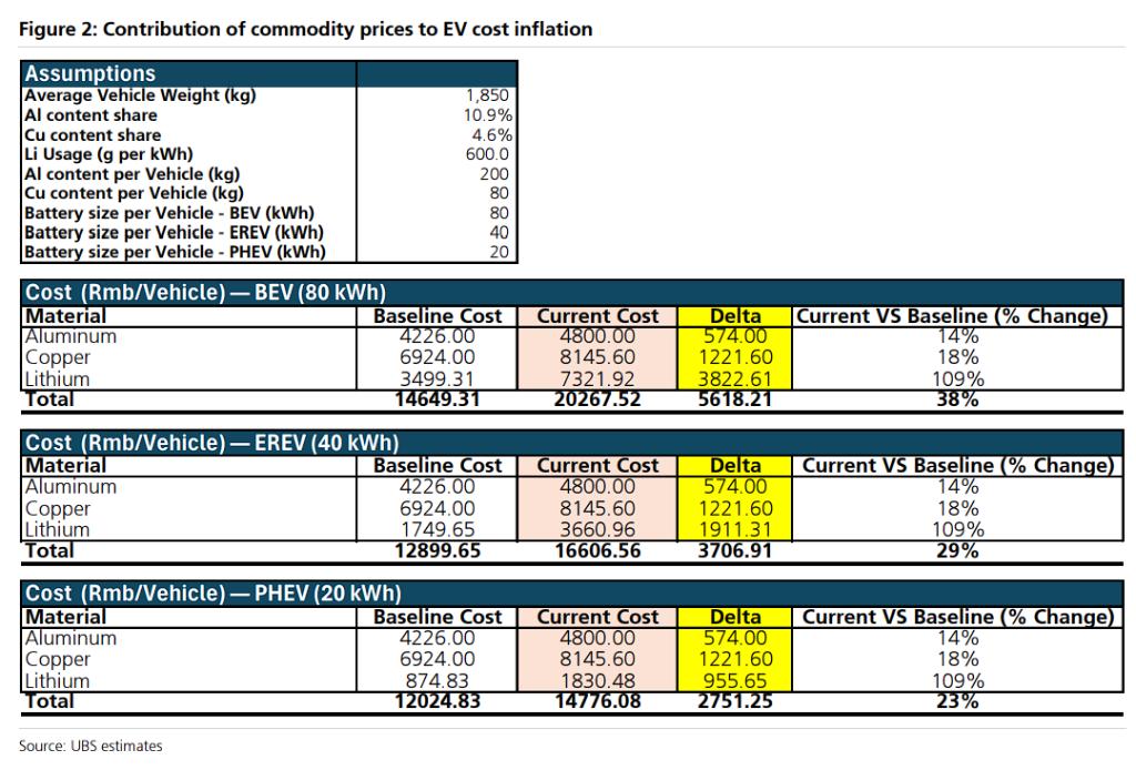 For example, last Monday, UBS released a report saying that within the past three months, lithium has risen by 115.4%, copper by 19.9%, and aluminum by 14.5%, which will lead to an increase of 4,000 to 7,000 RMB in the production cost of a mid-sized electric vehicle.